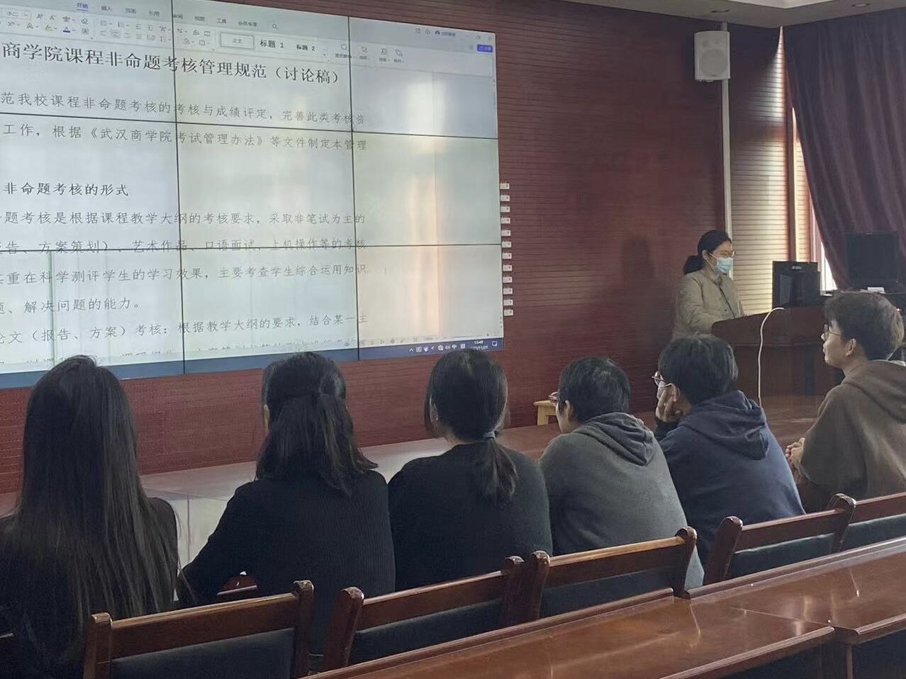 其次,老师们对非命题课程考核方案进行了学习。在此环节,吴惠升主任指出《永乐高70net课程非命题考核管理办法》(武商院教〔2023〕22号)与往年的不同之处,提醒老师们关注重点,然后老师们相互提问加深理解,并讨论如何修改完善所授课程的考核方案。